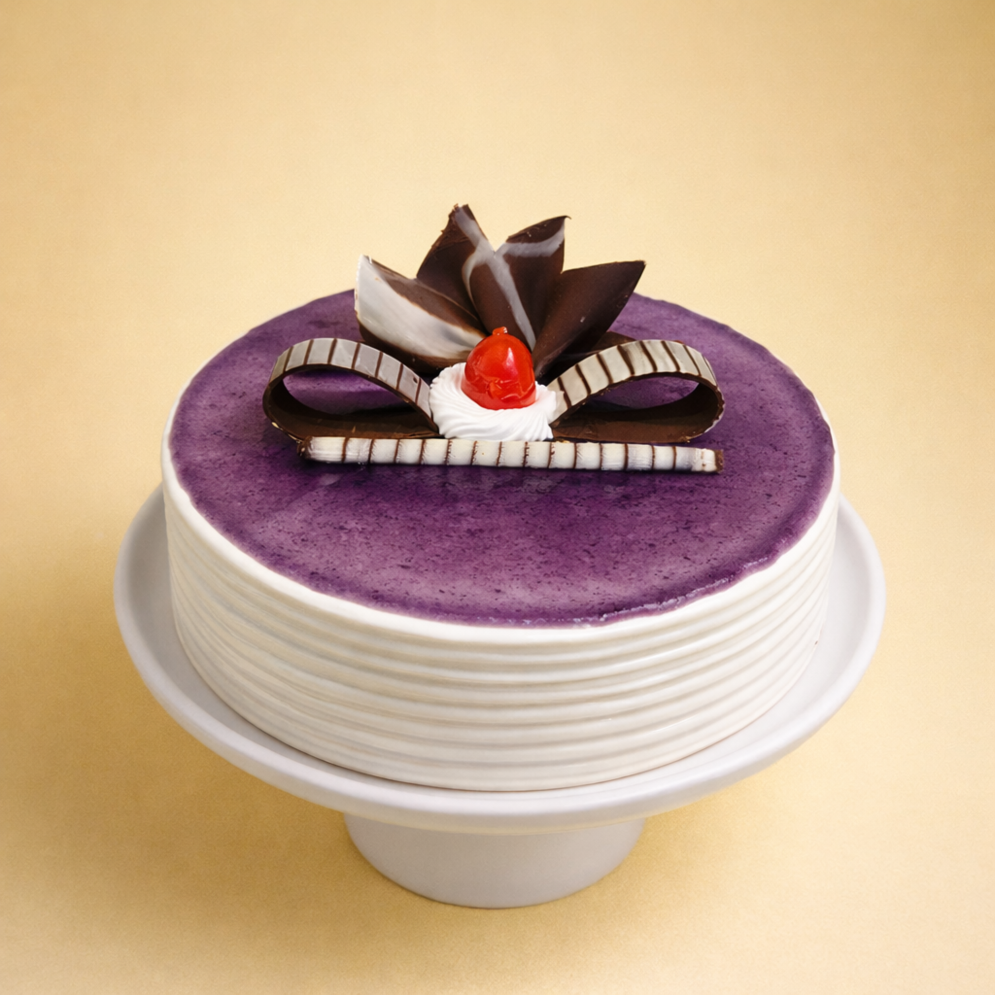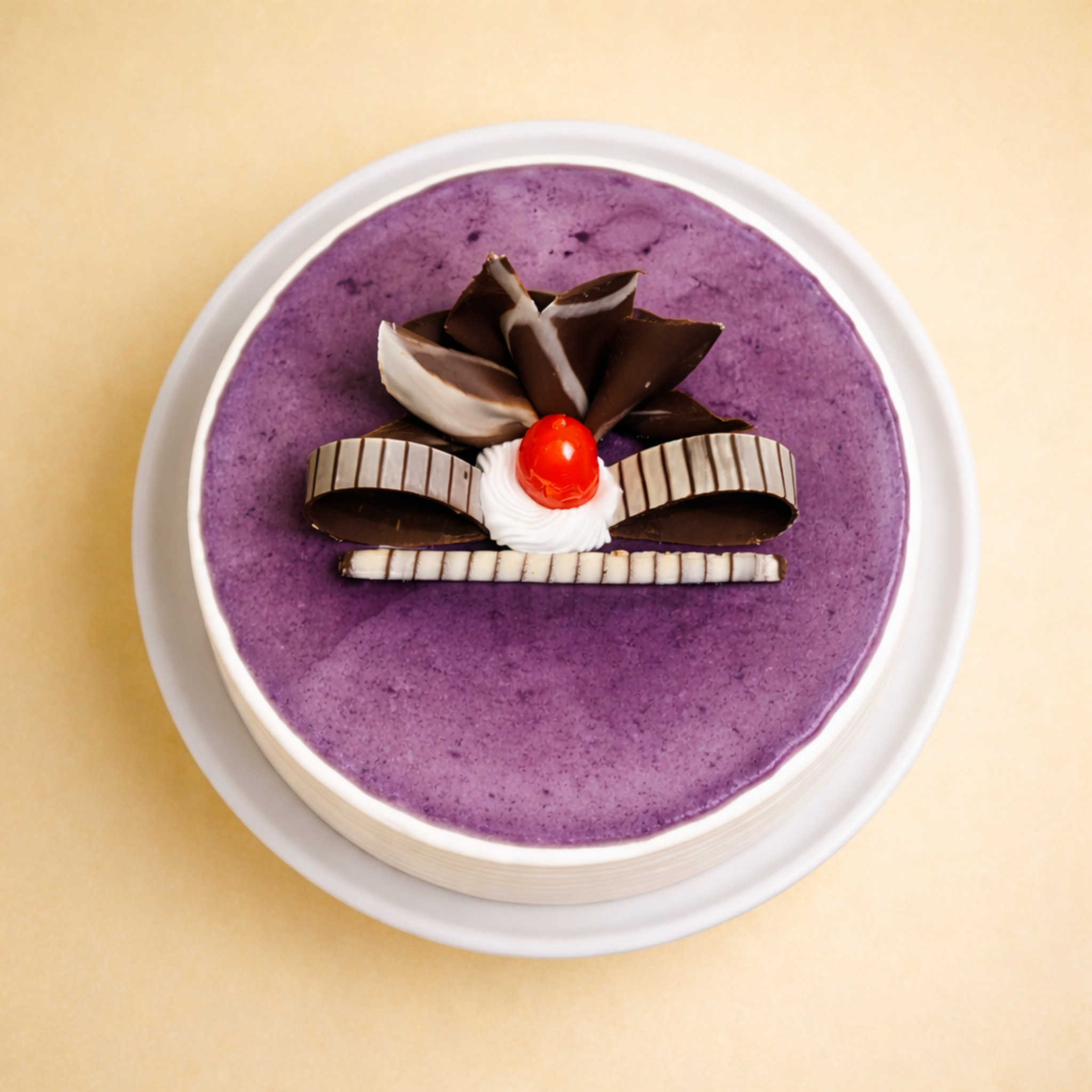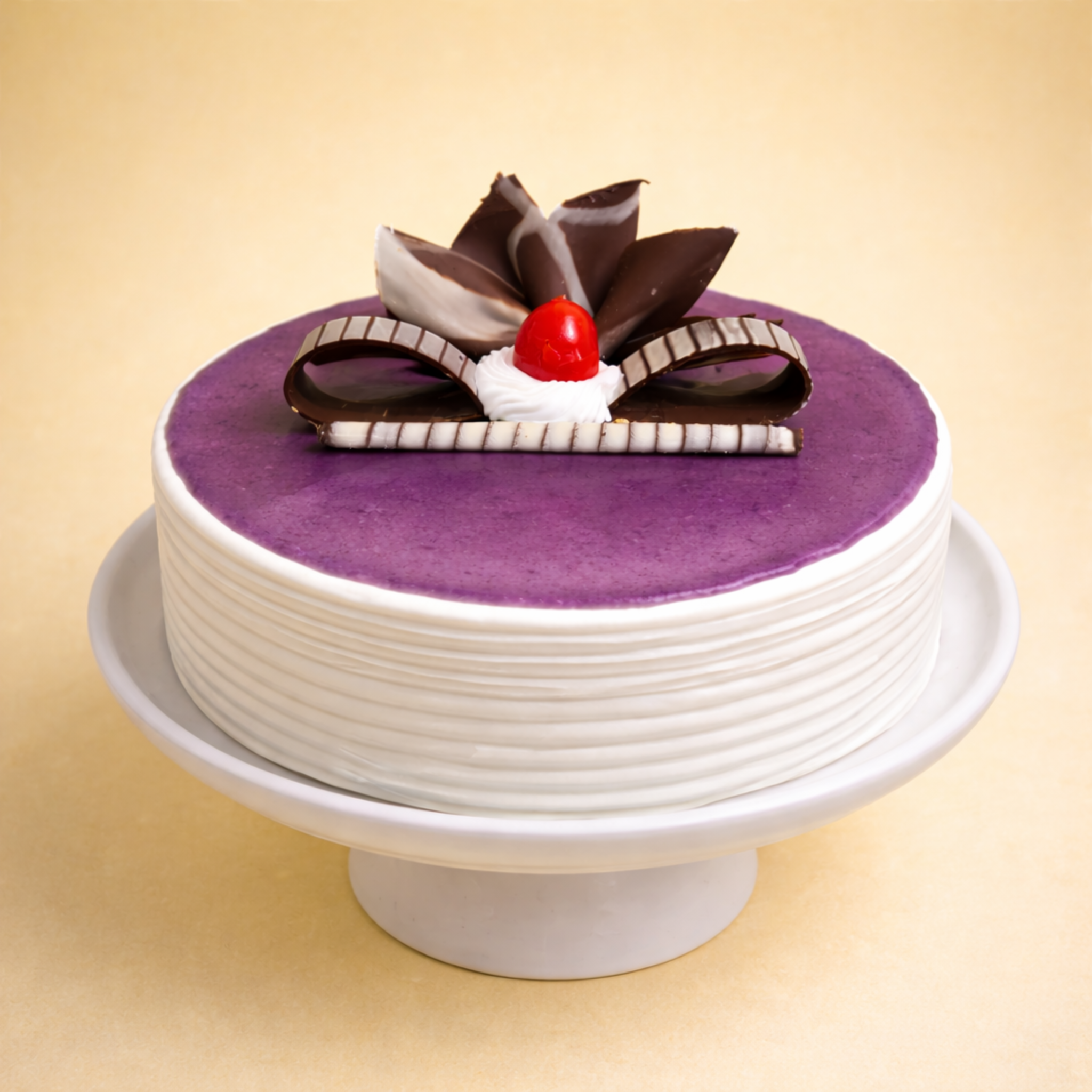 This Black Currant cake features soft sponge layers covered in smooth white cream and topped with a rich purple black current glaze. Finished with elegant chocolate decorations and a cherry garnish, it offers a perfect blend of fruity tanginess and sweet delight. 🎂🍒