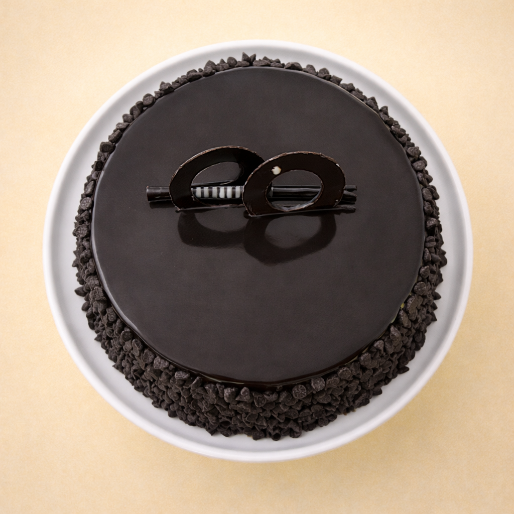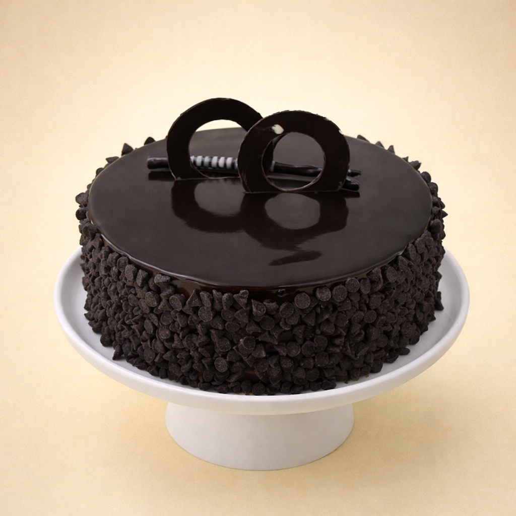 This Chocolate Chip cake features soft sponge layers covered with rich, smooth chocolate glaze. The sides are coated with crunchy chocolate chips and topped with elegant chocolate decorations for a rich and delightful chocolate treat. 🍫🎂